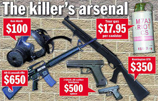 Todas las armas fueron compradas legalmente. Entre mayo y julio, Holmes además compró en Internet 3.000 balas para las pistolas, 3.000 balas para el AR-15 y 350 cartuchos para la escopeta. El 2 de julio pidió un chaleco de combate Blackhawk, dos portacargadores y un cuchillo en una tienda en línea.