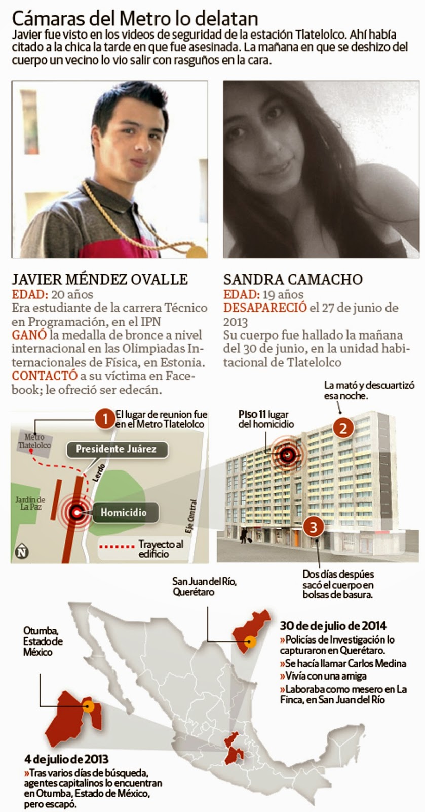 Se quedaron de ver en tlatelco con el fin de ir al departamento de él para hablar de negocios (se hacia pasar por promotor de edecanes) ESO DECIA LA NOTA, y ahi cometío el crimen, no salieron a ningún lado sino las camaras lo hubieran captado en Universidad y la ultima vez que se les vio fue saliendo del metro Tlatelolco, al desmembrar el cuerpo lo hizo con pulcritud de cirujano, perfectamente estudiado antes, el tipo sabía perfecto donde cortar, si fuese verdad que se preocupo tanto por el que diran sus vecinos al menos hubiera tenido más contacto con ellos, ya que solo saludaba con timidez y sin más (como tratando de evitar que lo conocieran o le vieran la cara desde antes) y como todos sabemos la mayoría de los asesinos quieren ser encontrados y reconocidos para llevarse "la gloria" de su hazaña por eso dejan huellas y pistas para su captura, porque ¿si era tan inteligente por que fue tan tonto de dejar los restos en una circunferencia cercana a su casa?, me parece que hasta dejo una pierna justo en el edificio de enfrente. Este tipo actuó con premeditación y ventaja usando su "territorio" para saber actuar, solo que repito como la mayoría de los asesinos tenía labia y poder de convencimiento, por eso todos al final se asombraban de que era un niño muy listo y educado.