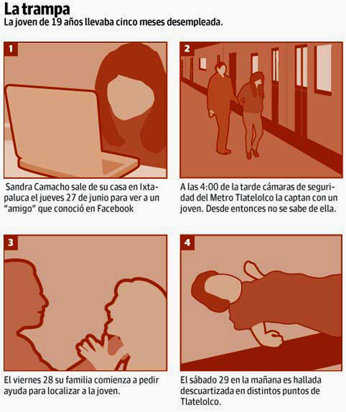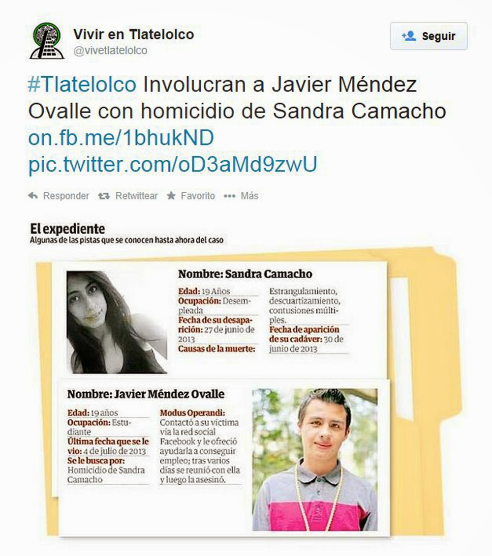 Sandra y Javier se conocieron en un grupo de amigos en el Facebook. Después de algunos comentarios y toques decidieron seguir hablando vía Inbox. Platicaron a lo largo de quince días, hasta que decidieron conocerse. El 27 de junio de 2013, Sandra le mintió a su familia, diciéndoles que iba a comprar unos libros en el centro de la ciudad. Ella y Javier se encontraron a las 16:00 horas, se encontraron afuera de la estación del Metro Tlatelolco; allí los captó una de las cámaras de seguridad de la estación. De ahí fueron a Plaza Universidad, donde entraron al cine y vieron una película. Cuando la chica le contó que no tenía empleo, Javier se ofreció a conseguirle un trabajo como edecán. La chica aceptó entusiasmada; un empleo así le dejaría suficiente tiempo libre para continuar con sus actividades sociales. Posteriormente se dirigieron a un parque de la delegación Benito Juárez, donde comenzaron a besarse y decidieron irse al departamento en el que vivía Javier, en la Unidad Habitacional Tlatelolco.