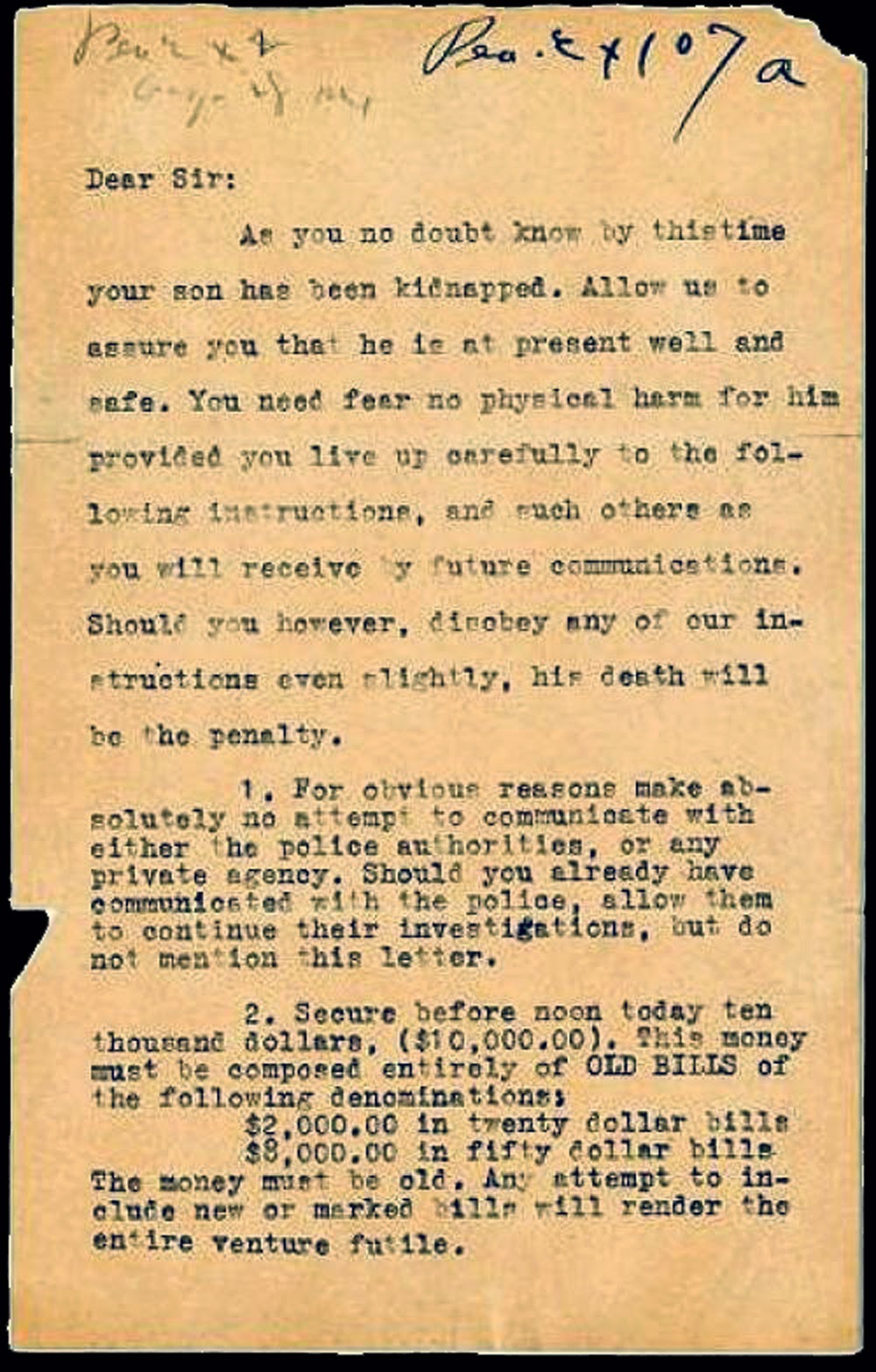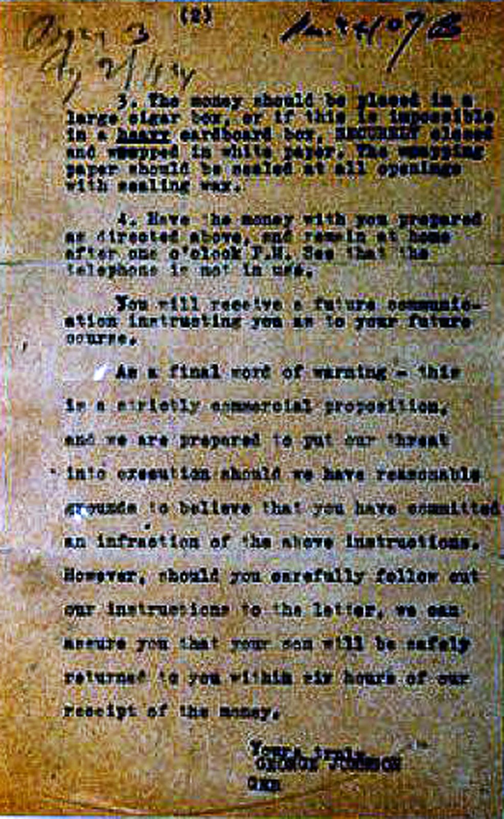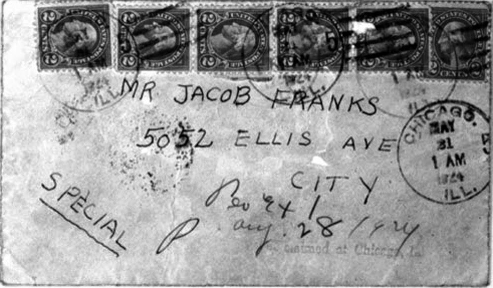 A las 02:00 horas, el señor Franks cambió de opinión y notificó la desaparición de su hijo a la policía, pero convenció al detective para que no hiciera nada hasta recibir más información ese mismo día. A las 09:00 horas, los trastornados padres recibieron una carta urgente. El mensaje estaba escrito a máquina en dos hojas. Empezaba con un “Muy señor mío” y le decía que su hijo sería puesto en libertad a cambio de un rescate de 10.000 dólares.