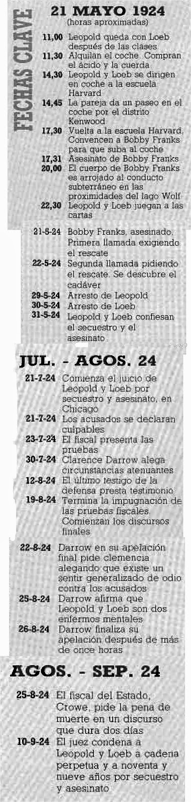 Luego el fiscal Crowe y sus ayudantes le preguntaron dónde había estado el 21 de mayo. A pesar de que ya había transcurrido más de una semana, el joven Leopold se acordaba perfectamente: fue a recoger el coche al garaje y luego, con un amigo, acudieron a Lincoln Park, donde habían quedado con dos chicas. Se mostró renuente a identificar a éste, pero finalmente confesó que se trataba de Richard Loeb, un joven de dieciocho años. Justificó no haber mencionado antes a su compañero porque las chicas con las que habían quedado no eran muy respetables.