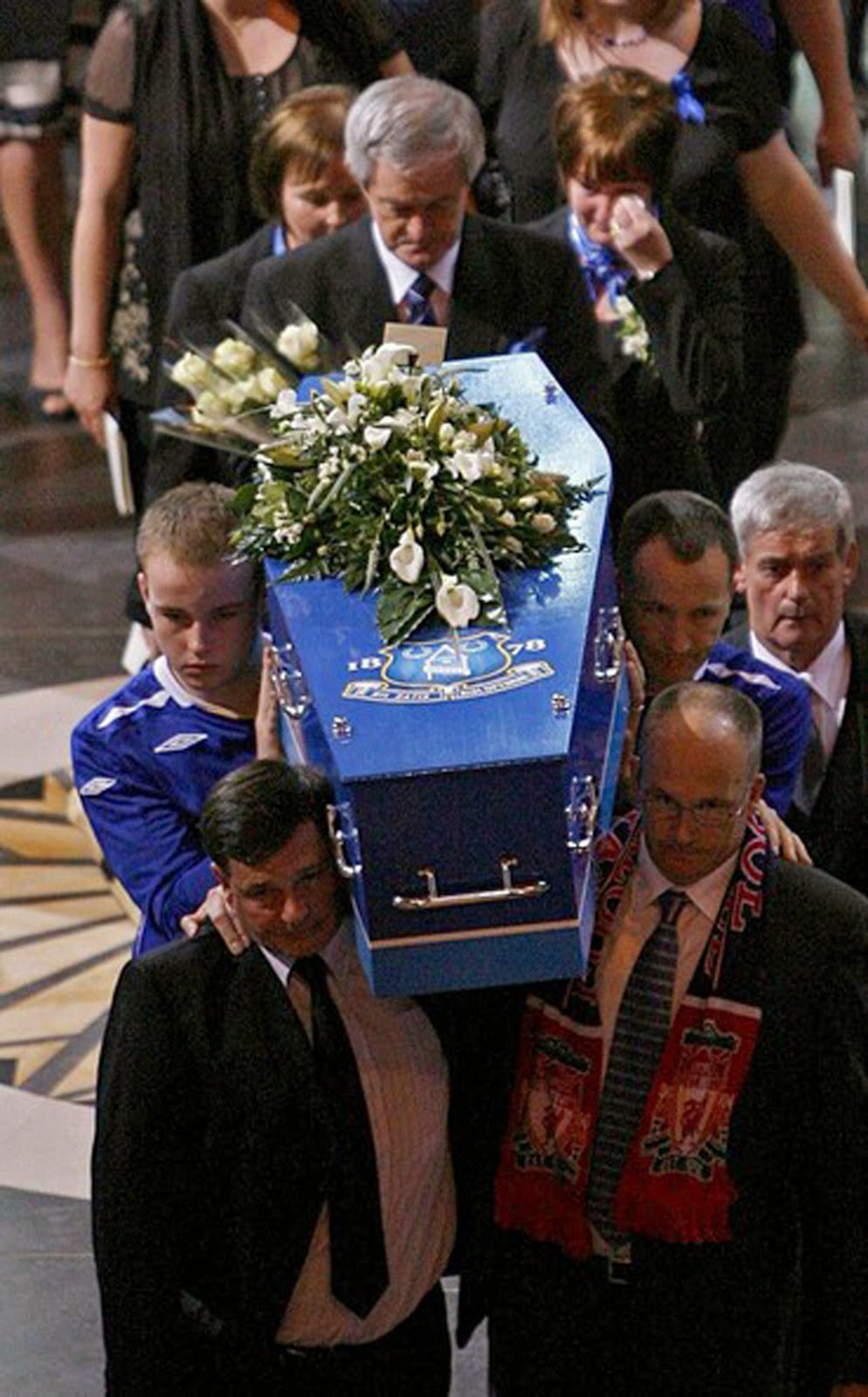 Algunos de ellos cargaron el ataúd del niño sobre sus hombros. Durante el servicio, el padre de Jones leyó un poema que había escrito para su hijo. El jugador del Everton, Alan Stubbs, leyó algunos versículos de la Biblia. Después de la misa hubo un entierro privado.