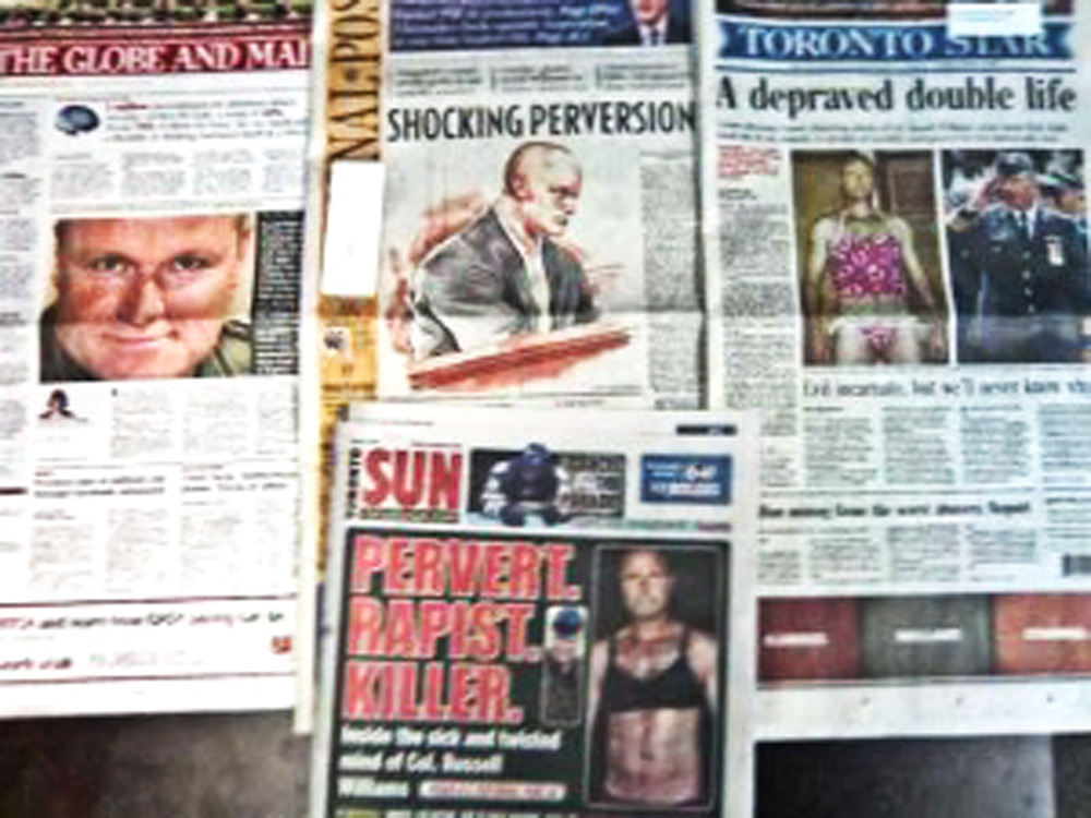 Los fiscales se limitaron a describir el contenido de su colección de torturas, violaciones y asesinatos grabados en vídeo, en lugar de mostrarlos al Jurado. La prensa publicó una serie de fotografías. El 21 de octubre de 2010, el juez Robert F. Scott condenó al coronel Russell Williams a dos cadenas perpetuas por asesinato y a otros 120 años por los demás cargos.