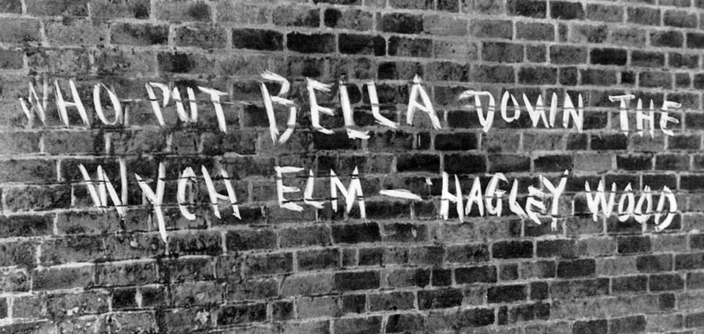La policía nunca descubrió el verdadero nombre de la víctima de Hagley Wood; pero un graffiti sí que la bautizó. En 1944, cuando la investigación policial comenzó a estancarse, empezaron a aparecer misteriosos mensajes pintados en las paredes de edificios abandonados por toda la zona de los West Midlands. Las pintadas parecían burlarse de la policía: “¿Quién puso a Bella en el Olmo de las Brujas de Hagley Wood?” era la más común. Algunas veces también se empleó el nombre de “Luebella”. Los detectives estaban impacientes por cazar al autor de estos letreros, esperando que fuera capaz de desvelar el misterio del crimen. Pero a pesar de que los mensajes estaban pintados con cuidado en letras de siete centímetros de ancho, nunca se consiguió descubrir al autor y tampoco se denunció a merodeadores por la zona. Para muchos, estos mensajes no eran más que una broma pesada. No obstante, los detectives estaban muy intrigados por la elección de los nombres “Bella” y “Luebella”, ambos diminutivos de “Isabella” o de “Clarabella”. Asimismo, estos nombres solían relacionarse con la brujería. ¿Estaba sugiriendo el misterioso pintor una pista específica?