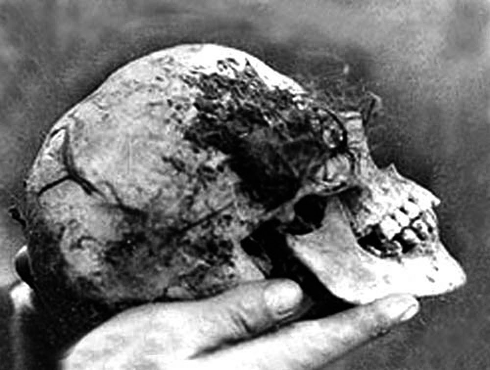 El muchacho se encaramó a unos cuantos pies de altura y descubrió una gran cavidad. Escudriñó la oscuridad; de pronto, apareció ante él un rostro. Cortó una rama para tocar la cara con un palo y con el movimiento se dio cuenta de que era un cráneo humano. Los chicos salieron corriendo, presas del pánico.
