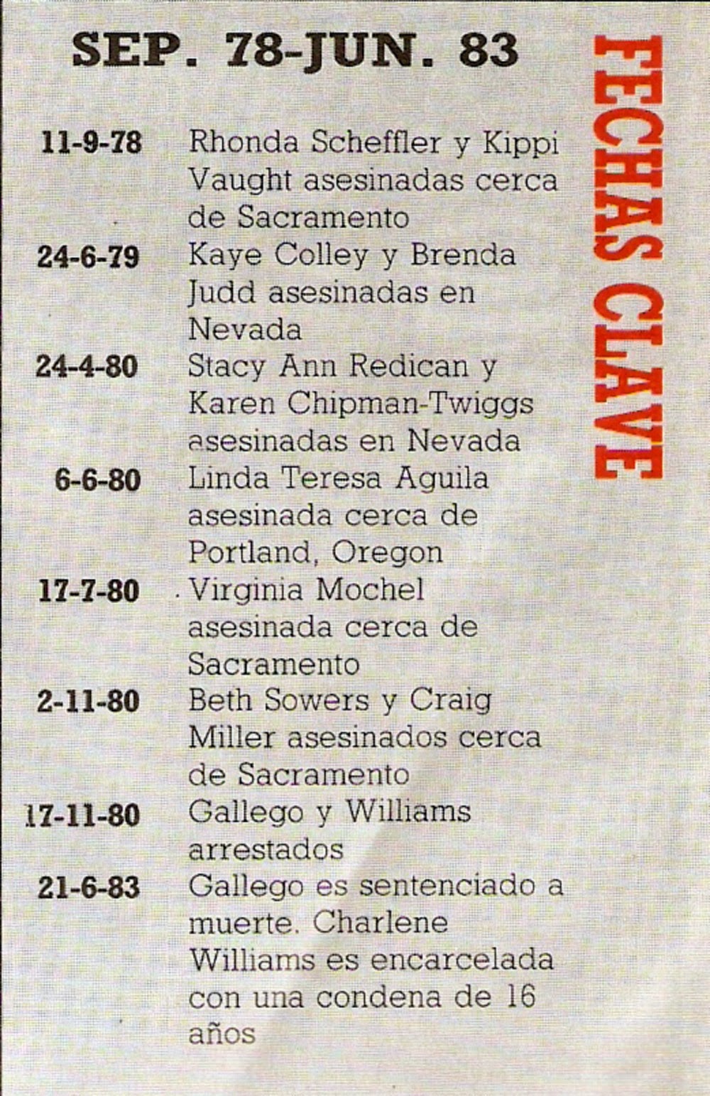 Entonces intentó negociar. Confesó que llevaban dos años y medio cometiendo asesinatos con el único propósito de intentar ocultar las violaciones. Gallego tenía un insaciable apetito sexual. El papel que Charlene Williams había desempeñado era el de ayudar a su compañero a realizar sus deseos.